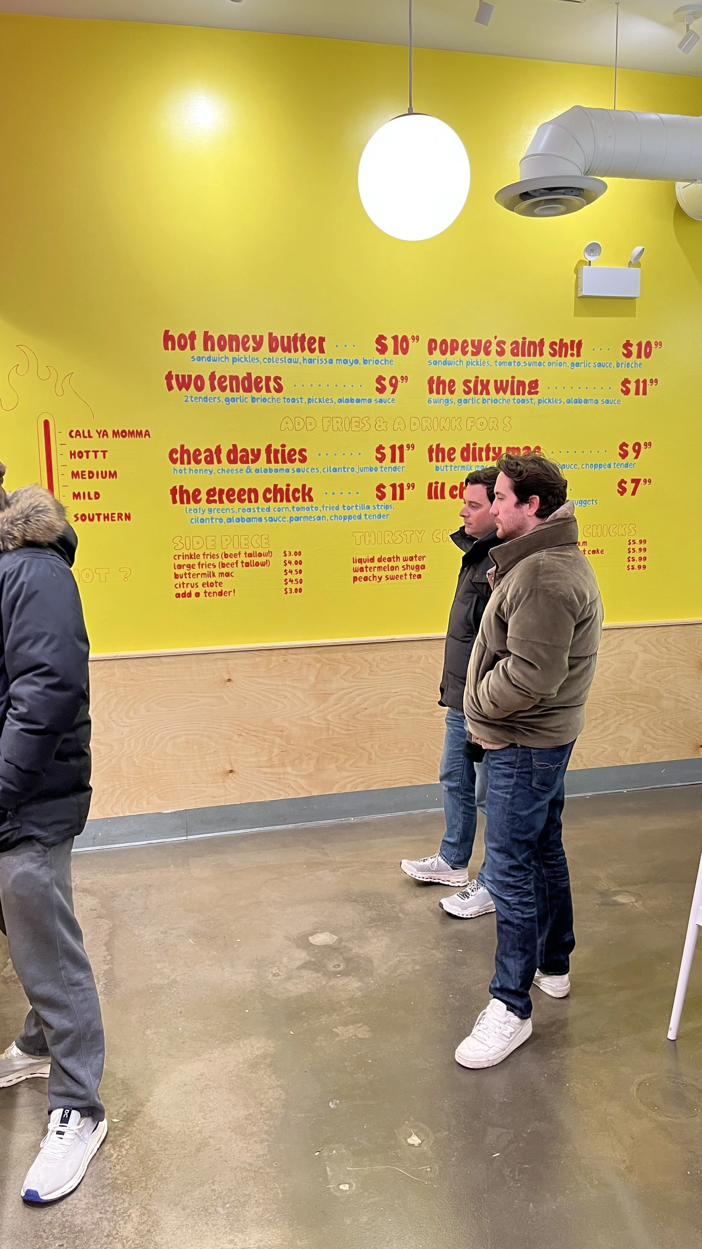 People standing in front of a yellow wall with a menu in red and blue text in a restaurant, offering various fried foods, drinks, and sides.