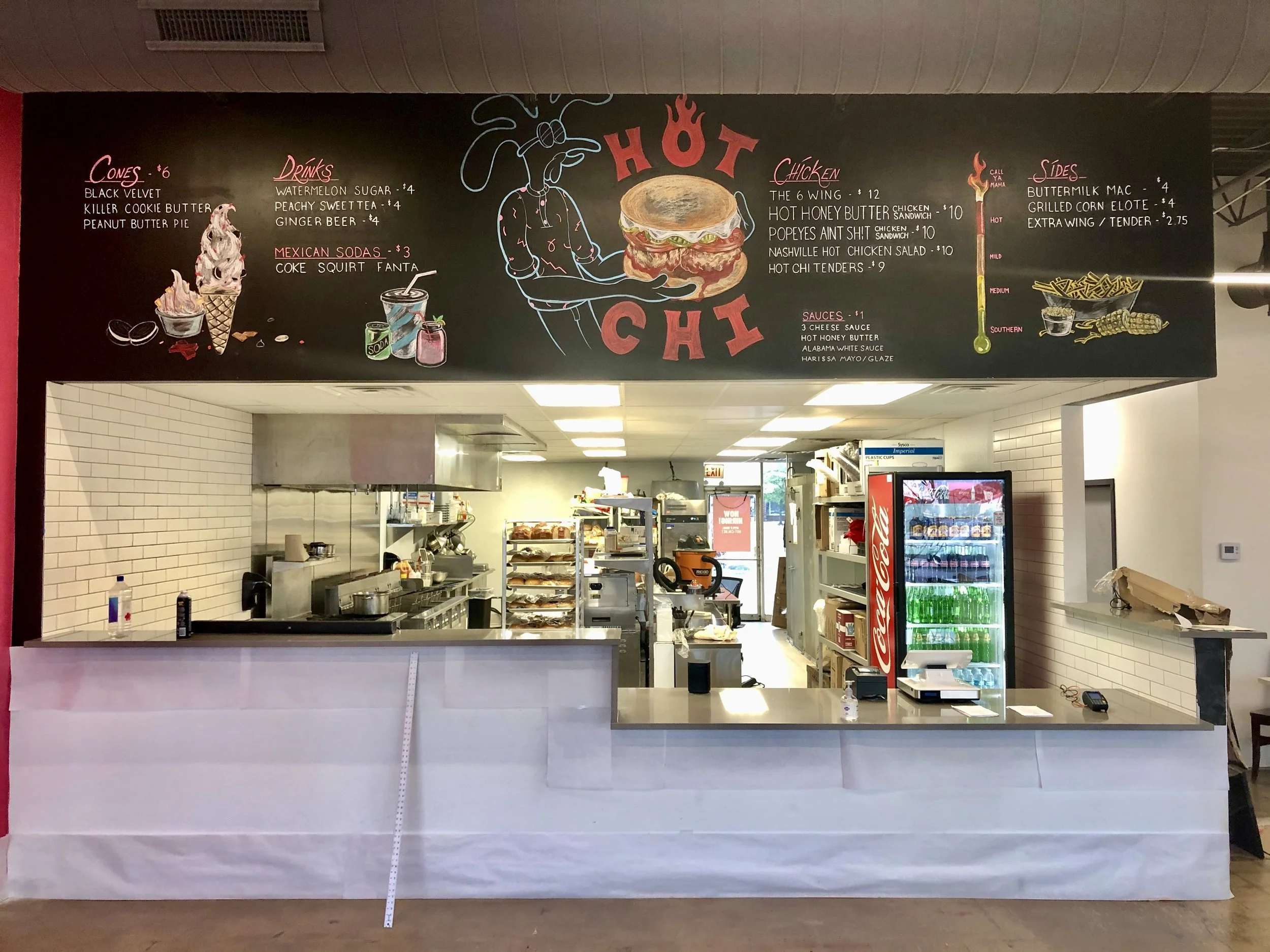 Hand-painted chalkboard menu boards for HOTCHI’s 87th street location in Chicago’s Chatham. Custom lettering and bold illustrations designed to match their Nashville hot chicken brand and enhance the customer experience.